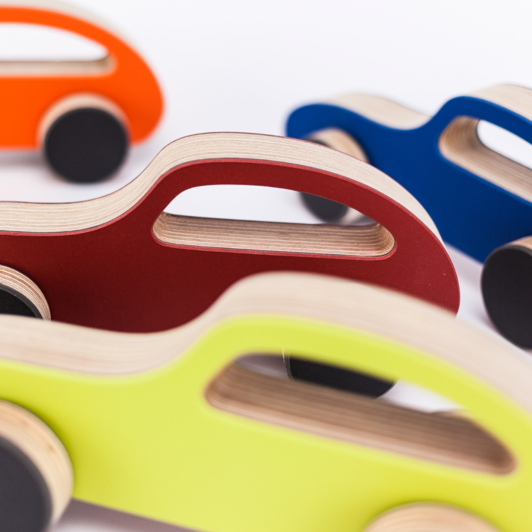 Design-Spielzeugauto aus Birkenschichtholz mit Linoleumbeschichtung.